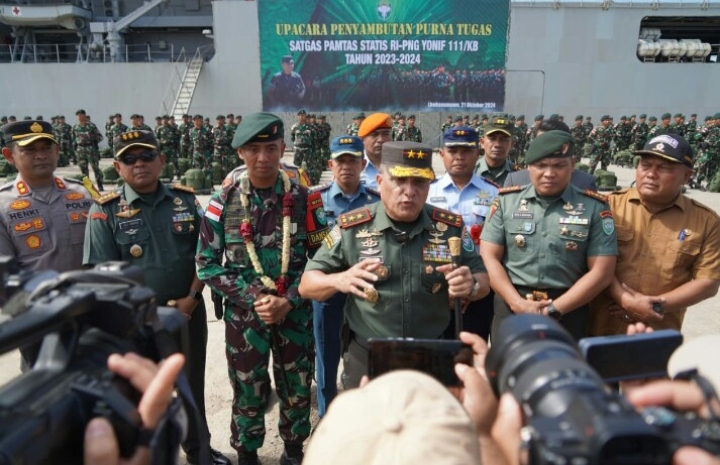 Banda Aceh — PRESINDO.com — Panglima Komando Daerah Militer Iskandar Muda (Pangdam IM) Mayor Jenderal TNI Niko Fahrizal, M. Tr. (Han), menyambut kepulangan 450 Orang Prajurit Satgas Pengamanan Perbatasan (Pamtas) Statis RI-PNG Kewilayahan dari Batalyon Infanteri (Yonif) 111/Karma Bhakti yang telah berhasil menyelesaikan tugas di wilayah perbatasan Indonesia dan Papua Nugini. Bertempat di Pelabuhan Krueng Geukueh, Lhokhemawe, Senin (21/10/24).