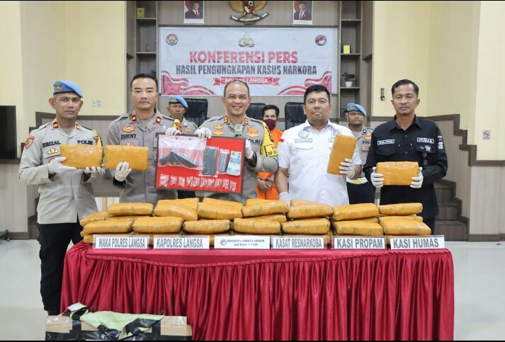 PRESINDO.com | Kota Langsa – Kepolisian Resor Langsa berhasil mengungkap peredaran ganja dalam jumlah besar, dengan total barang bukti mencapai 58.850 gram. Kasus ini diungkap dalam konferensi pers yang diselenggarakan di Aula Adhi Pradana, Polres Langsa, Jumat (15/11), dipimpin langsung oleh Kapolres Langsa, AKBP Andy Rahmansyah, S.I.K., S.H., M.H., serta dihadiri oleh sejumlah pejabat kepolisian.