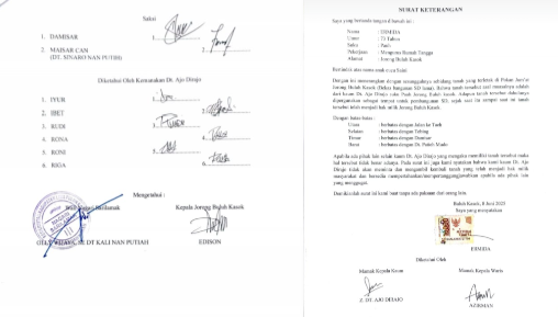 “Demi Allah saya bersumpah, bahwa saya tidak pernah menandatangani surat itu. Sebab saya dalam keadaan sakit parah sebulan ini. Baru hari ini saya bisa duduk.” kata Dt Ajo Dirajo saat kami konfirmasi dikediamannya Rabu 18 Juni 2025.